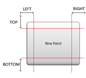 The Nine Patch is defined by the width/height of its top, bottom, left and right borders. These are given in pixels and relative to the image's top/left, and bottom/right corners. Typically, you will wish to set these values so that they encapsulate the areas of your source-image which shall remain in their original size, such as the edges or drop shadows of a button. The following image illustrates this concept.