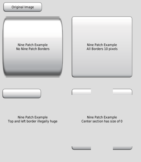 Supplying the Nine Patch with illegal values, such as border sizes which exceed the original image's dimensions, will result in a visual output as shown in the two examples at the bottom. Also, make sure, that you leave a center section of at least 1 pixel, so that the center area will be filled and not remain empty.