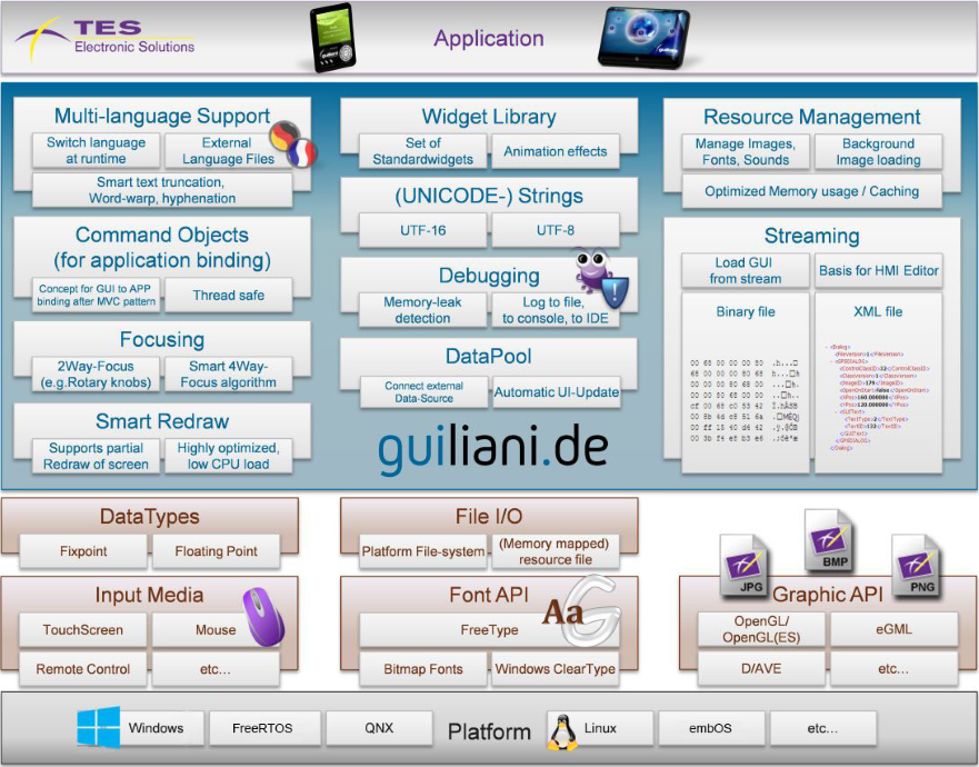 Guiliani is a flexible C++ framework for graphical user interfaces suited for the use in embedded systems with a special focus on platform independence.