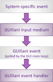 Each Guiliani event is represented by a class derived from CGUIEvent. Currently Guiliani supports keyboard and mouse events. Therefore, any system event that ought to be handled by Guiliani has to be mapped to one of these by an input medium class.