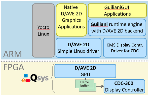 Programmable SoCs are used in many highly innovative embedded projects. Therefore TES proudly introduces a new kit based on IntelPSG's Cyclone V SOC, namely based on the D10-Nano-Kit. This resource efficient package is based on the silicon and FPGA proven CDC display controller IP core, the D/AVE 2D GPU IP core, Linux drivers, and the Guiliani GUI Framework.