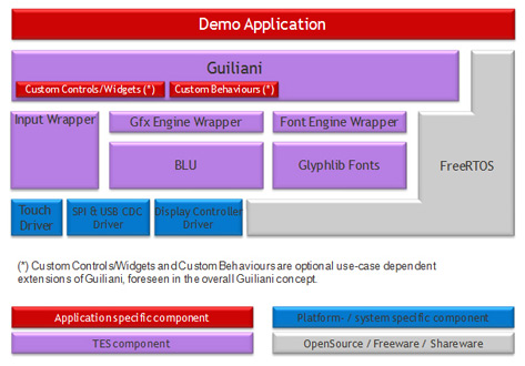 The package also includes the Guiliani graphical user interface designer (GSE) and the corresponding example project files and tools to easily modify and extend the example application on a PC, to run a simulation on a PC and download the result to the Rx63 Board.